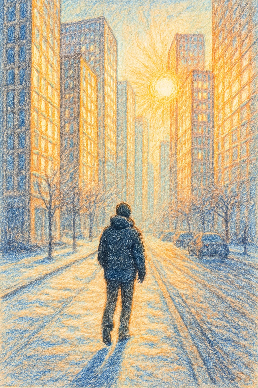 The image used to open this piece was generated by the author using ChatGPT 5.1 on Nov 18, 2025, using the prompt, “Show me a colored pencil style drawing based on the following prompt: The February morning was crisp-cold. The sun, shining with all its might, reflected off the hundreds of skyscraper windows lining my walk, seeming to outline the shapes in my peripheral vision.”