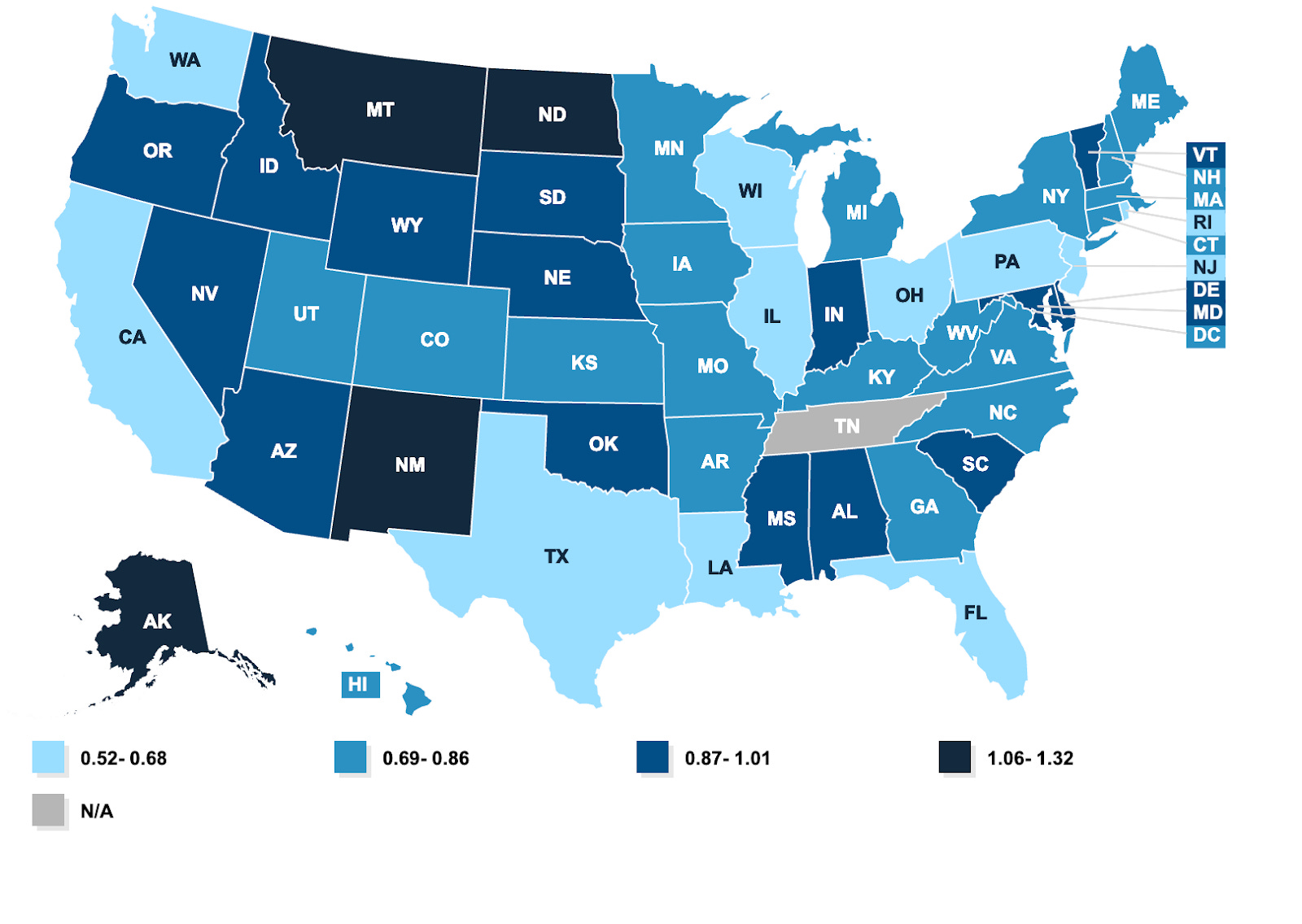 The Center for Medicare and Medicaid Services plans to lower Medicare reimbursement rates in 2026. If Medicare doesn’t pay well, then Medicaid, which is indexed to Medicare, pays even worse. Medicaid reimburses doctors significantly below cost—on average, it pays 72% of the already low Medicare rate. In some states, that percentage is much lower, as illustrated by the chart below of the Medicare-to-Medicaid Fee Index by State.